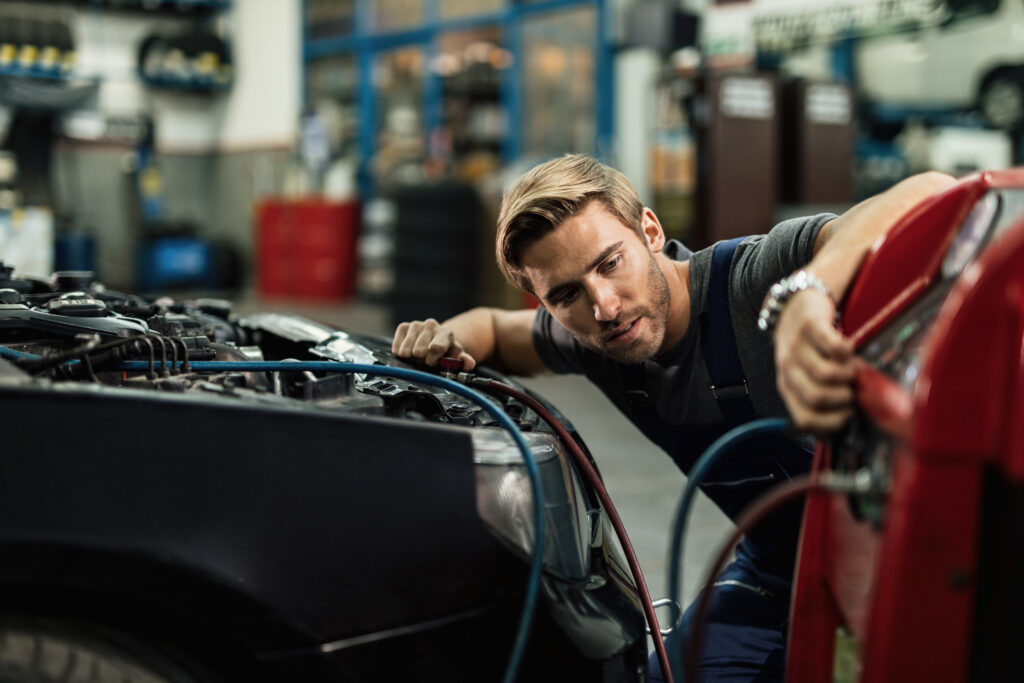 Young auto mechanic using compressor while maintaining AC unit of a car at workshop.